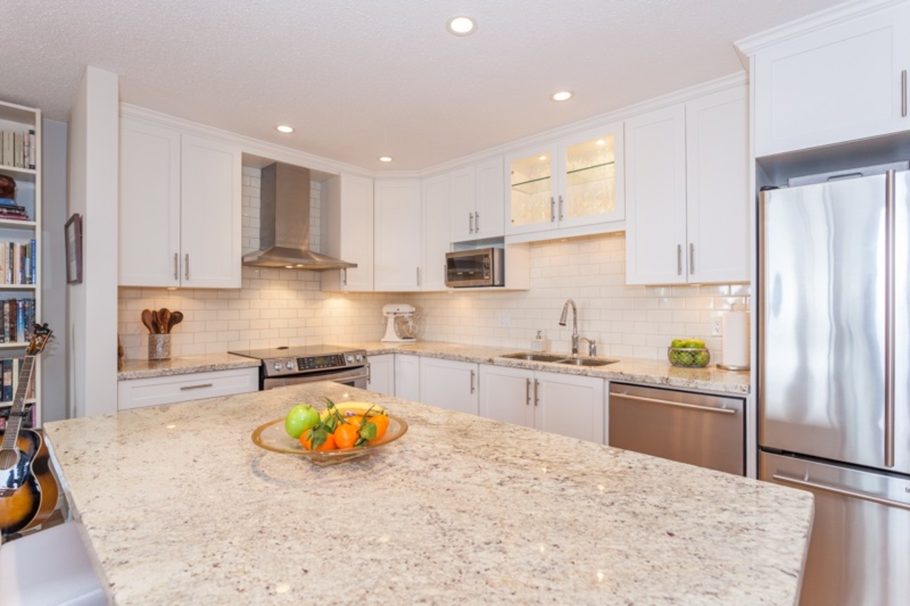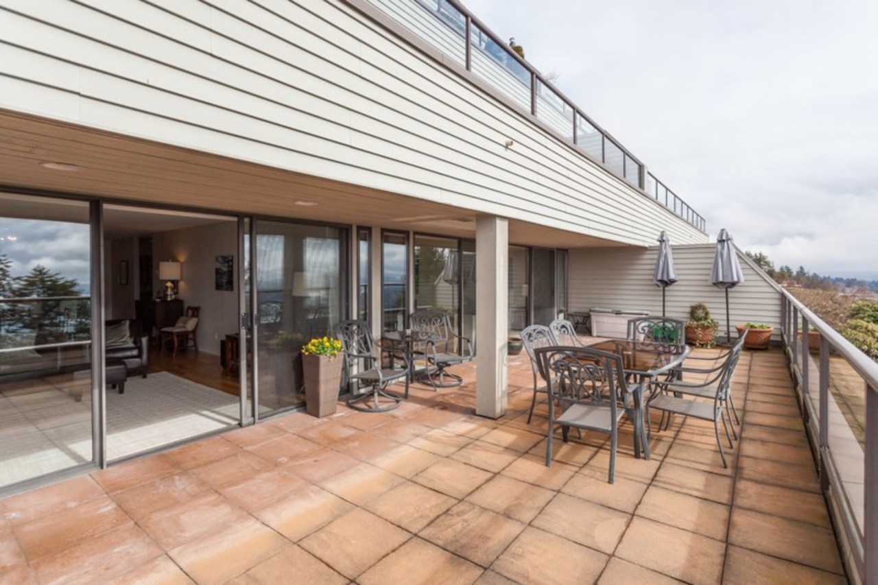 Enjoy living above the clouds! This 2 bed, 2 bath condo is beautiful, spacious & bright. Tastefully renovated, everyone will love the large open-concept kitchen with shaker cabinets, granite countertops, and oak hardwood floors (strata approved). A functional layout with updated bathrooms, large walk-in closet in the master bedroom, plus a huge balcony that spans the width of the condo with spectacular panoramic ocean and city views. The living room and both bedrooms get …plenty of light with wide views and access to the balcony. One-level living with entry straight from 2 parking stalls. Panoramic Gardens includes a newly renovated clubhouse with kitchen, billiards, gym, pool, hot tub & sauna. Also enjoy the use of the private tennis court or racquetball courts! Open house Sat/Sun 2-4pm.