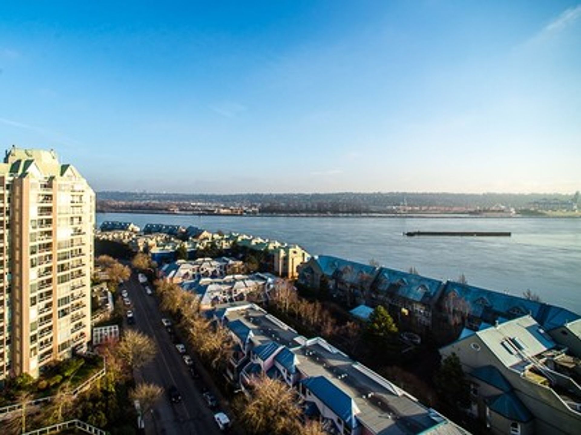 Enjoy beautiful unobstructed views over historical Fraser River from this rarely available 1435 sq.ft. sub-penthouse home. Floor to ceiling windows and open plan provide spectacular views from every room including 2 large private patios. Enjoy your latte watching the sunrise and lounge over your favorite bbq at sunset. WOW! This immaculate 1 owner home features a spacious kitchen, eat-in area and lots of counter tops/cabinets, built in buffet, skylights, gas f/p, huge master …with ensuite, 2 parking, & locker. Stroll along the seawall to the Market, Sky Train, or walk to your favorite cafe! All this in a well-maintained re-piped, BOSA building with excellent management. This home is perfect for your lifestyle.